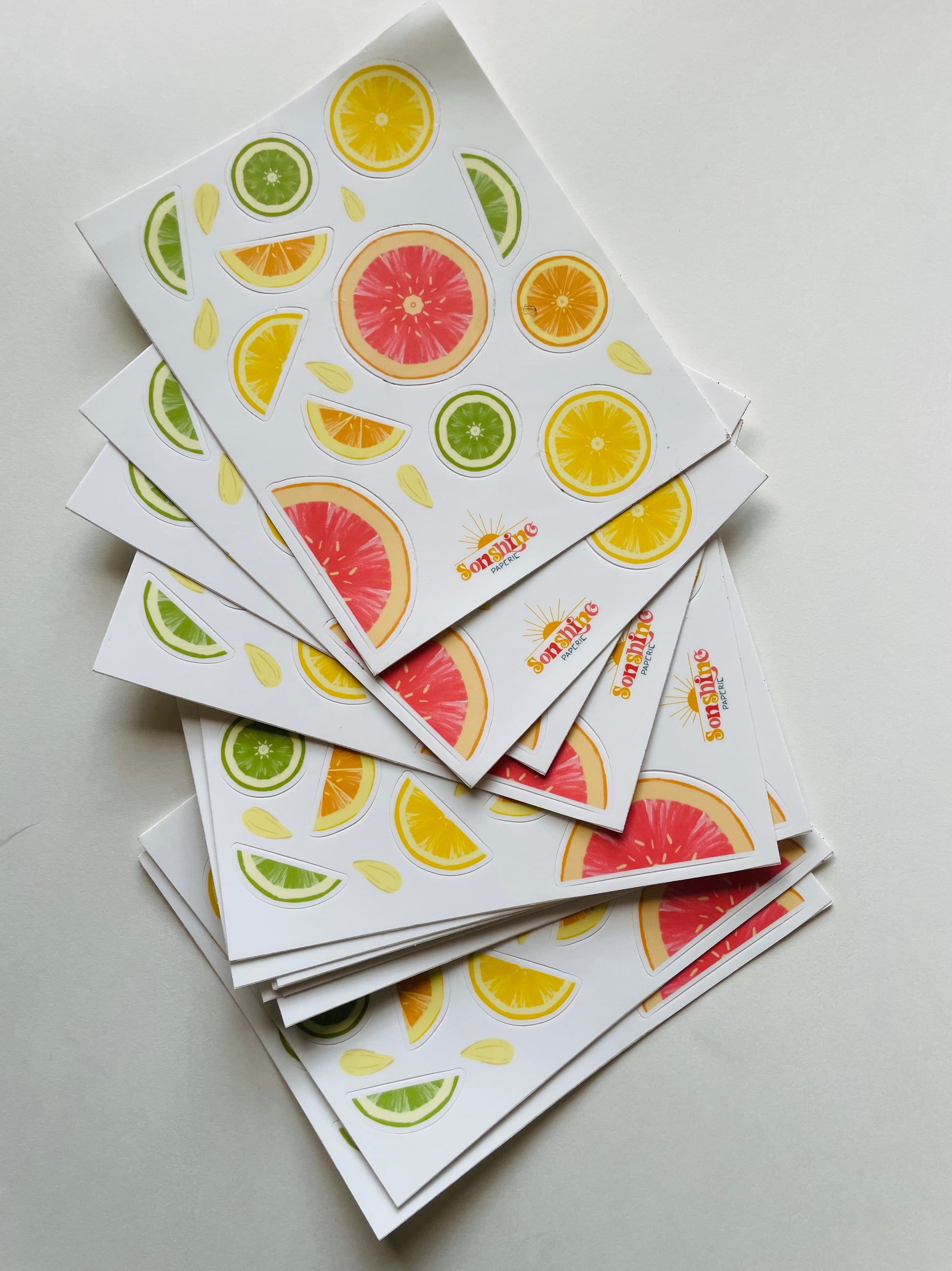 Take your personal style to the next level with our premium vinyl Citrus Stickers! This sheet of stickers features a variety of citrus designs that can stick onto any surface, adding a playful touch to your everyday items. Perfect for dressing up envelopes, laptops, phones and water bottles. Pairs perfectly with our Summer Fruit Cards.
