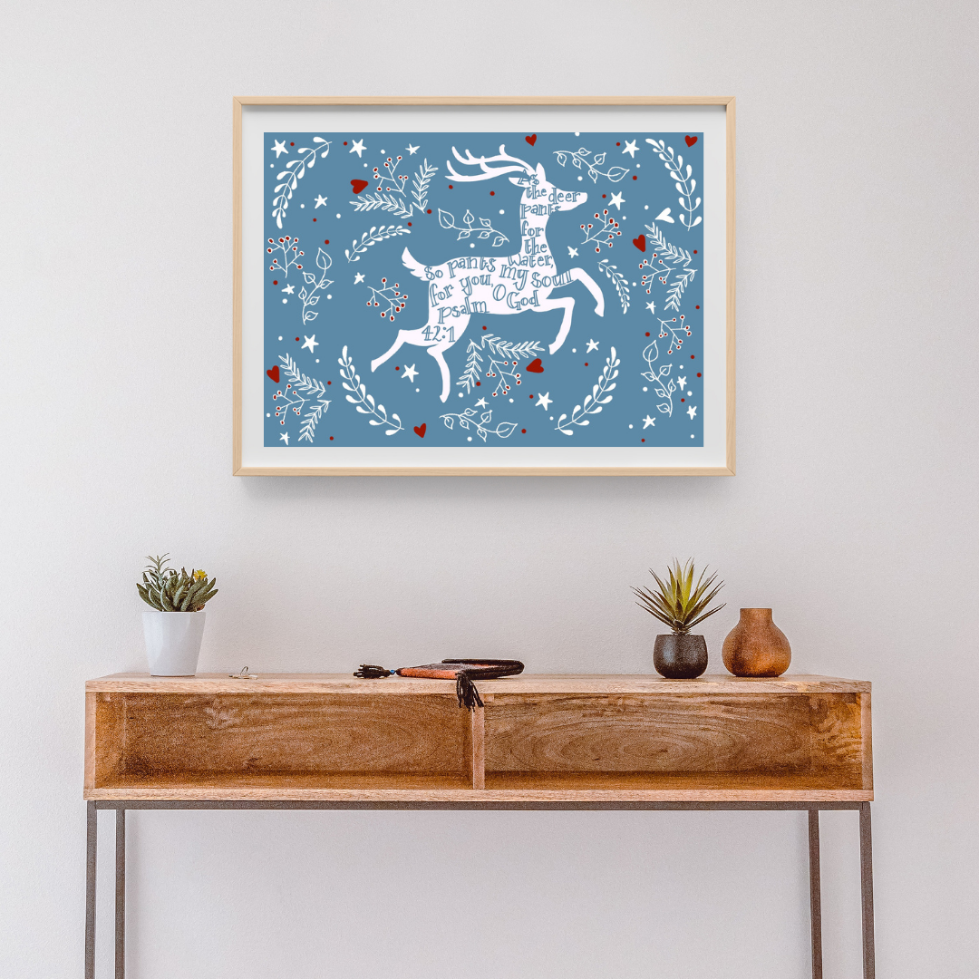 Capture the longing of the soul with this stunning "As the Deer" art print, inspired by Psalm 42:1. Featuring a graceful silhouette of a deer intertwined with the verse, "As the deer pants for the water, so my soul pants for you, O God," this piece reflects a deep yearning for divine connection. The soft blue background is adorned with delicate hand-drawn accents of leaves, berries, and hearts, adding a whimsical yet reverent touch to your decor.