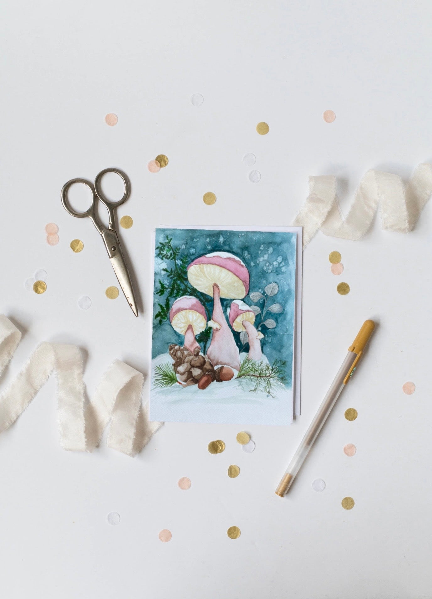 Step into a winter wonderland with our Enchanted Winter Collection, a dreamy array of hand-painted greeting cards that bring the quiet magic of the season to life. Each card in this collection is carefully illustrated in watercolor, featuring whimsical forest scenes, delicate mushrooms dusted in snow, and cozy woodland creatures nestled in their winter hideaways. With hues of deep teal, snowy whites, and rich reds, these cards capture the essence of an enchanted forest blanketed in winter’s touch.