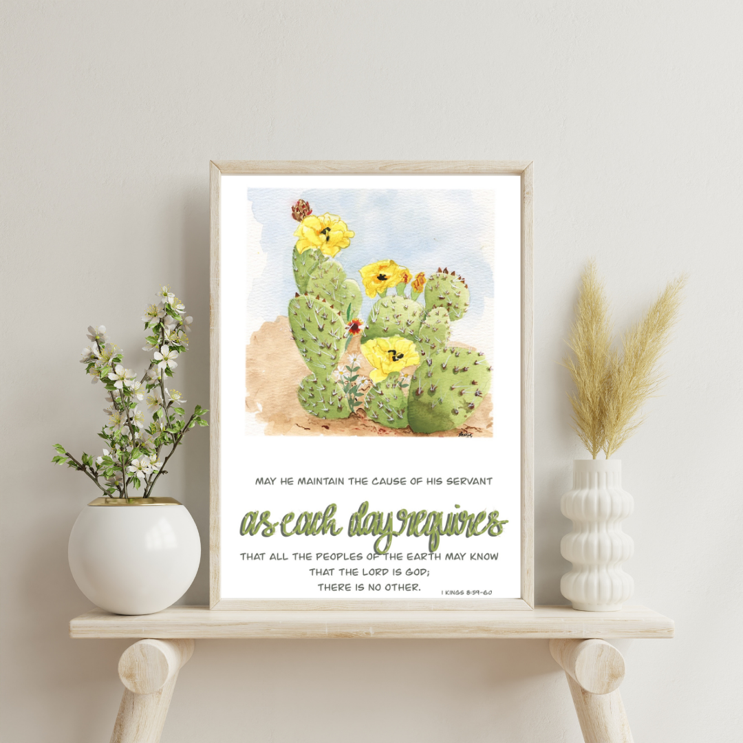 Introducing our *Desert Bloom Faith Art Print* – a beautiful blend of watercolor artistry and inspiring scripture. This piece features a hand-painted cactus adorned with vibrant yellow blossoms, set against a soft desert landscape. Below, the powerful verse from 1 Kings 8:59-60 is elegantly displayed: *"May He maintain the cause of His servant as each day requires, that all the peoples of the earth may know that the Lord is God; there is no other."*