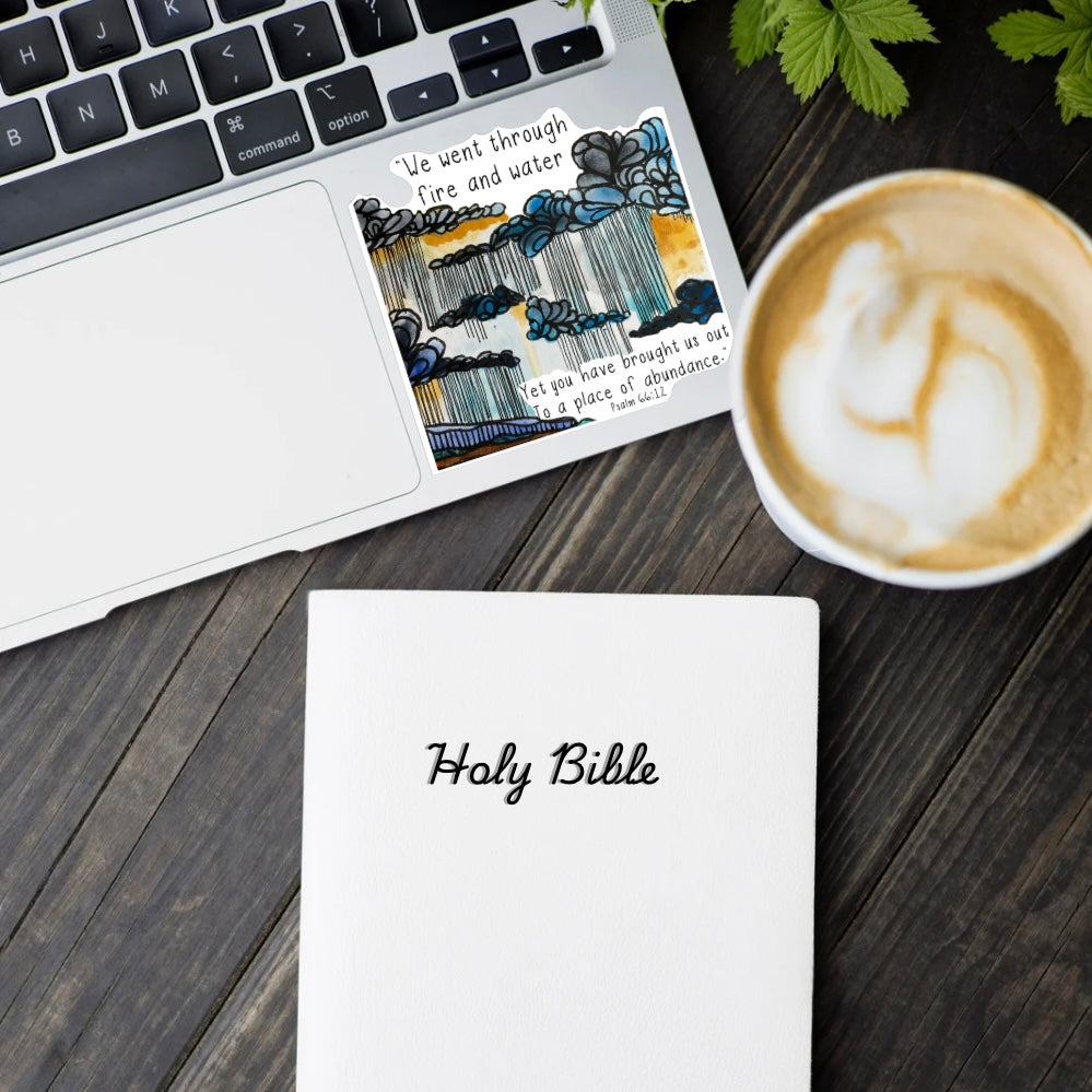 Transform your journal, planner, or Bible with the stunning “Fire and Water” sticker featuring the powerful words of Psalm 66:12: “We went through fire and water, yet you have brought us out to a place of abundance.” This powerful, trial affirming, faith and trust confirming sticker beautifully blends hand-painted elements of fire and water with watercolor clouds and rain, symbolizing the trials and triumphs of life. Perfect for your faith journaling, Bible study notes, or simply adding a touch of inspiration to your daily routine.