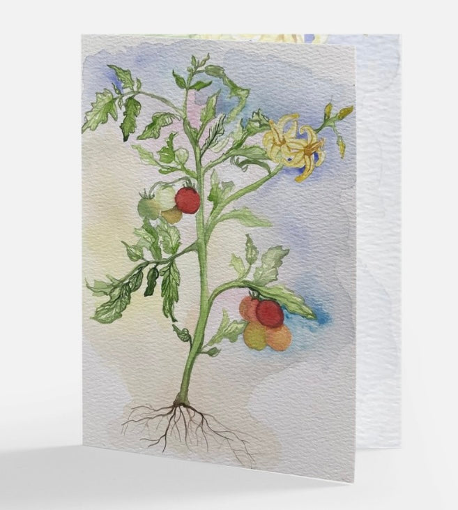 Add a burst of summer joy to your greetings with our Fresh Tomatoes Greeting Card set. Hand painted with vibrant watercolors, each card features a bright and happy tomato plant. The interior is left blank for your personalized message.