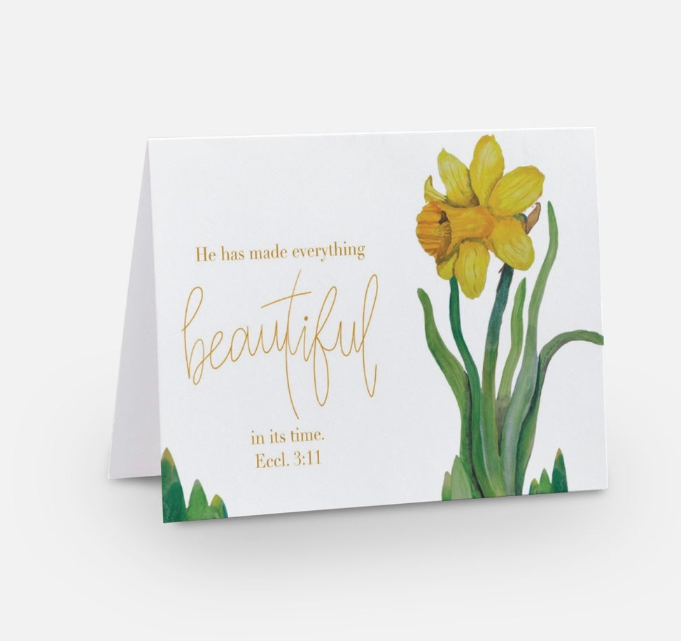 Let the beauty of nature speak for itself with this watercolor daffodil greeting card. Perfect for any occasion, this card features scriptures to remind us to embrace the present. Show you care with this unique and charming card.