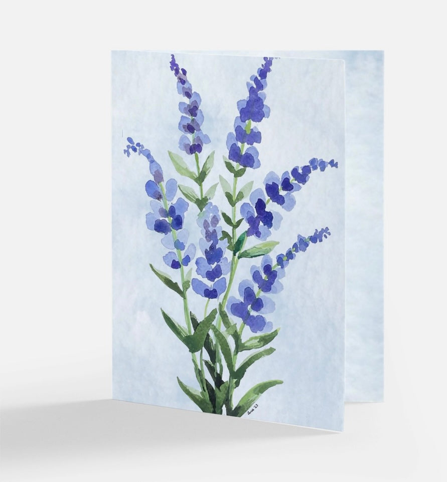 The sweet, loose strokes of each delicate lavender bloom and verdant foliage evoke a sense of tranquility and serenity, making it a perfect choice for summer greetings.