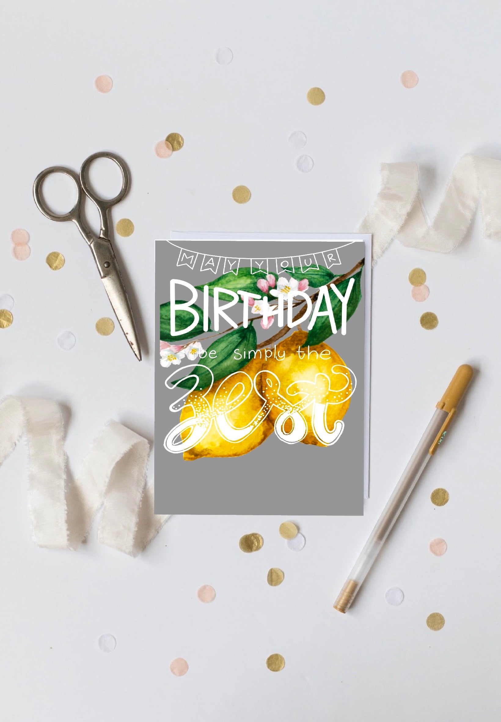 This lemon-themed birthday card is simply the zest! With a charming hand-drawn lettering and a watercolor lemon branch painting, it's the perfect way to send zesty birthday wishes. May your special day be filled with joy, just like the bright and cheerful colors on this card.