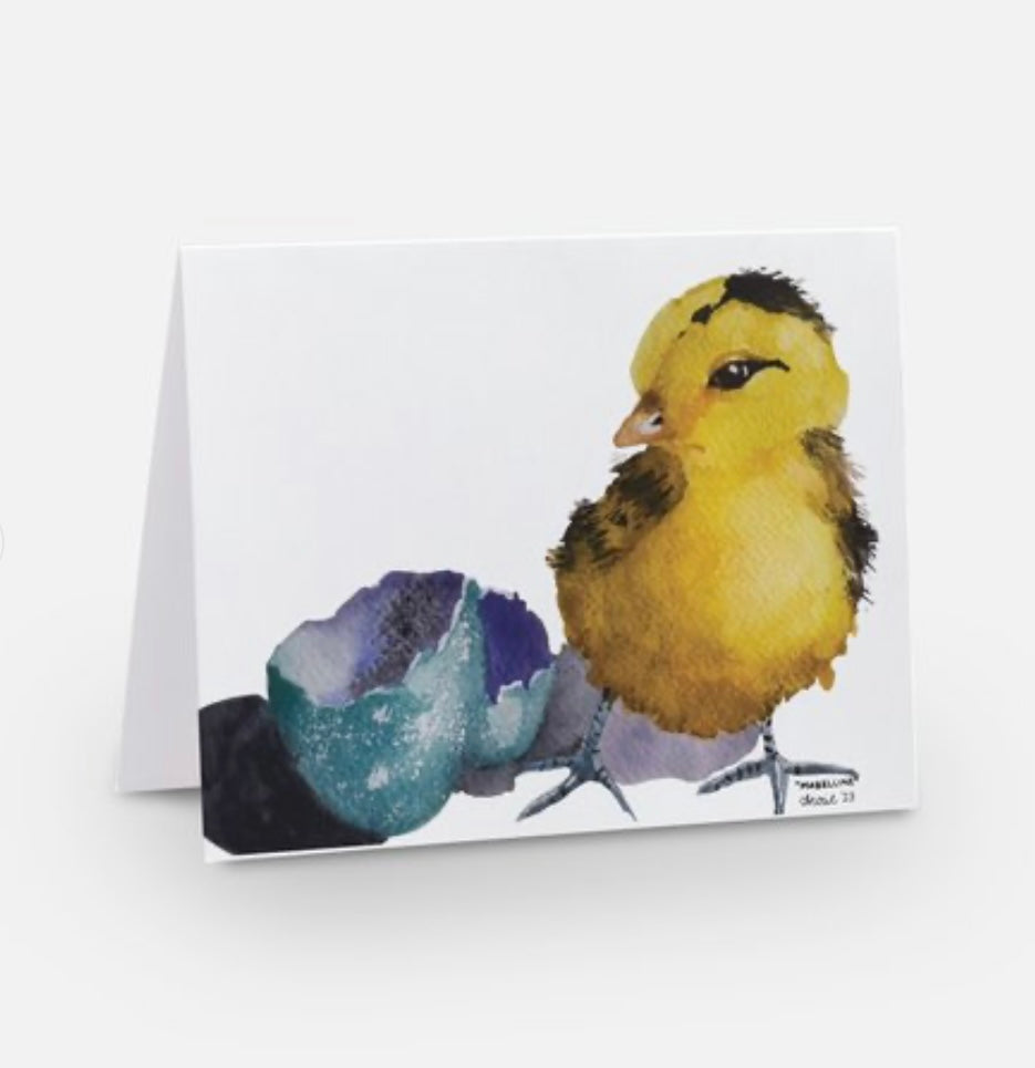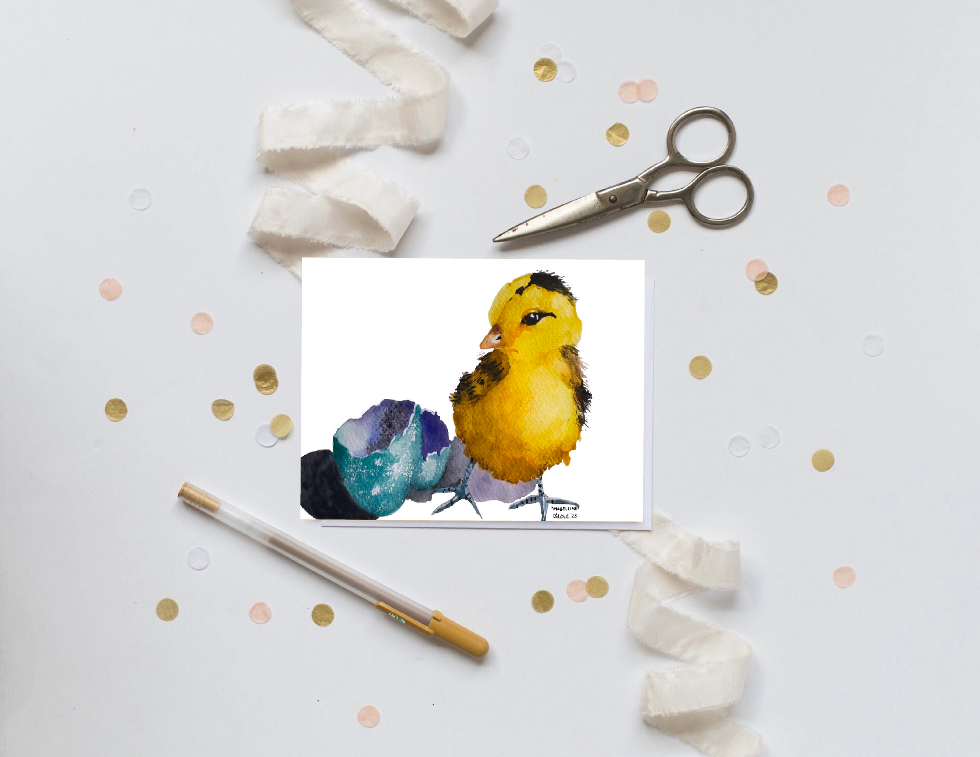 Spring is hatching! Add Maybelline, our adorable Easter Egger chick to your spring stationery! She is such a sweetie pie and the perfect inspiration for this watercolor painting. Perfect for adding a touch of whimsy and color to your celebrations! (She's a great place-setting card or table decor. Pop her in a frame for easy and sweet spring decor!)