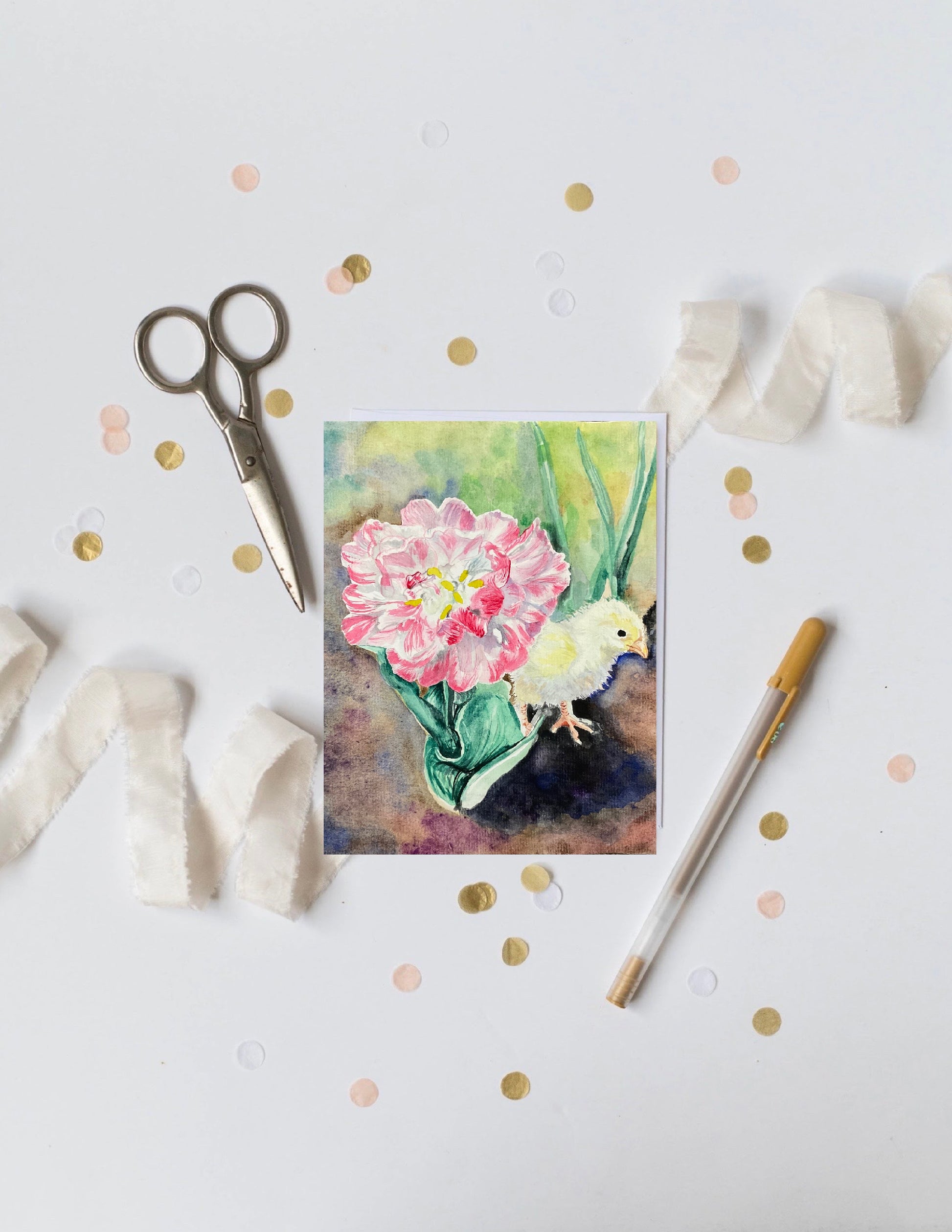 Nugget. Our very first chicken. She was all things fluff, cuteness, curiosity, snuggles, and sweetness. So when she played peek-a-boo behind the tulips one sunny afternoon, I captured the moment. Now I get to share her with you! Send all your sweet Easter wishes inside this card of pure spring joy.