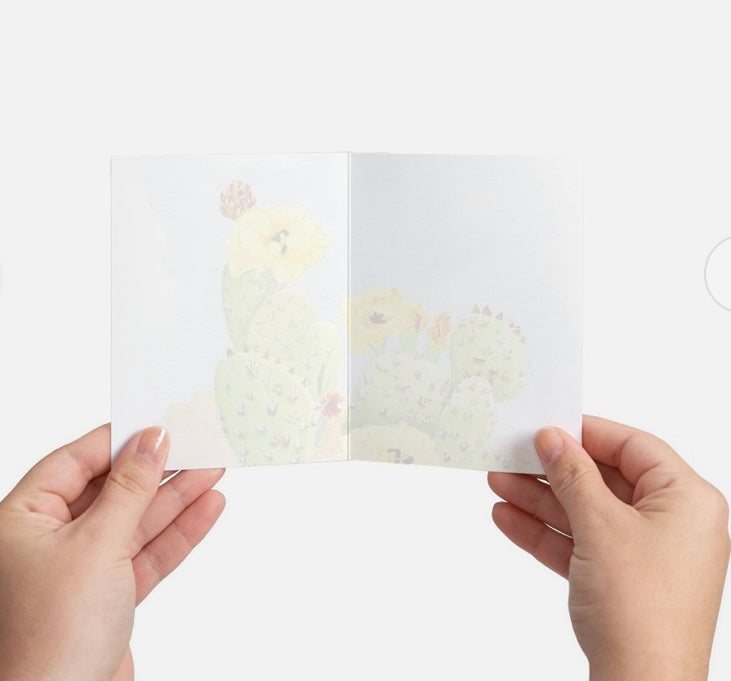 Elevate your correspondence with our exquisite Texas Prickly Pear Greeting Card, featuring a stunning watercolor illustration that brings the vibrant beauty of the Texas desert to life. Painted on location at Copper Breaks State Park.